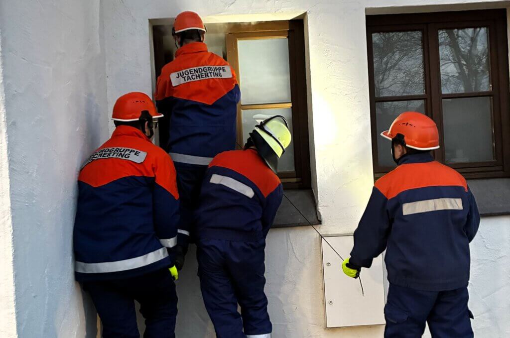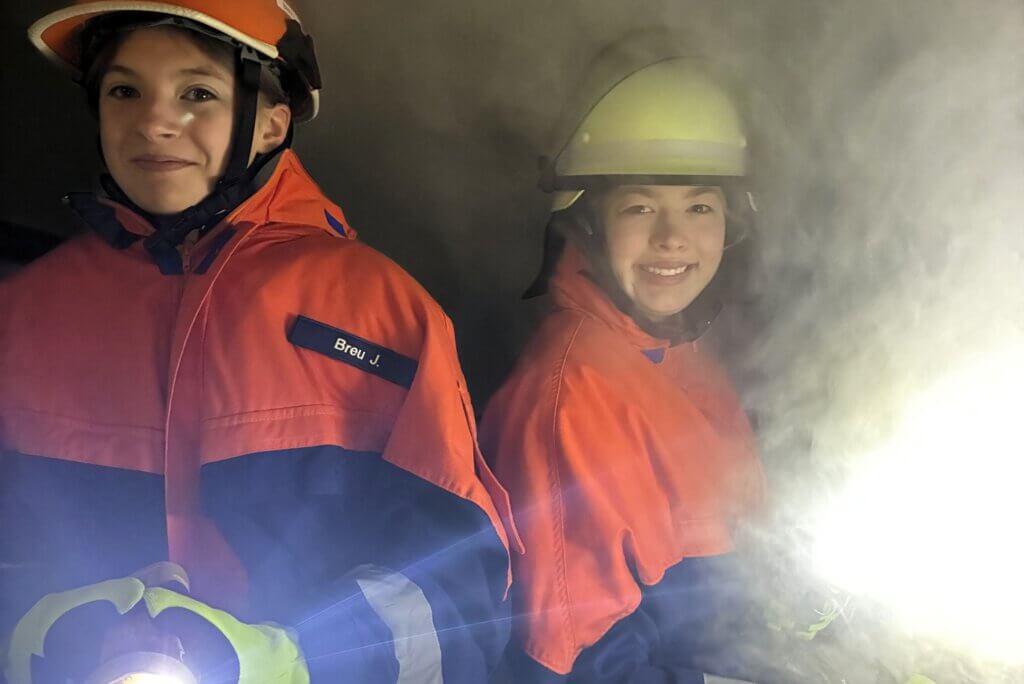 Auch die Nacht blieb nicht ruhig: Am frühen Samstagmorgen mussten die Jugendlichen eine verrauchte Wohnung durchsuchen und sich trotz Hindernissen in einem vernebelten Raum orientieren. Um den Löschmeistern von Morgen ein Gefühl zu vermitteln, wie es sich anfühlt, wenn man die Hand vor Augen nicht sieht, kam dazu sogenannter Disconebel zum Einsatz. Parallel dazu wurde der Umgang mit verschiedenen Werkzeugen geübt. Anschließend stand eine Wohnungsöffnung auf dem Programm. Dabei musste ein Trupp eine vermisste Person in einem Gebäude suchen und per Funk den Gruppenführer informieren, während ein zweiter Trupp den Funkverkehr verfolgte und anschließend den Weg zur Person erklären musste.