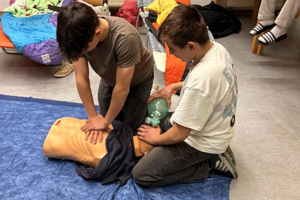 Nach dem Abendessen ging es mit einer Übung zur Absturzsicherung weiter. Am sogenannten „Säuresee“ musste ein Gegenstand aus einem abgesperrten Bereich geborgen werden, ohne den Boden zu berühren. Parallel dazu stand Erste Hilfe auf dem Ausbildungsplan, unter anderem Reanimation sowie die Helmabnahme bei einem Motorradunfall. Zwischendurch blieb auch Zeit für Freizeit und Fußballspielen.